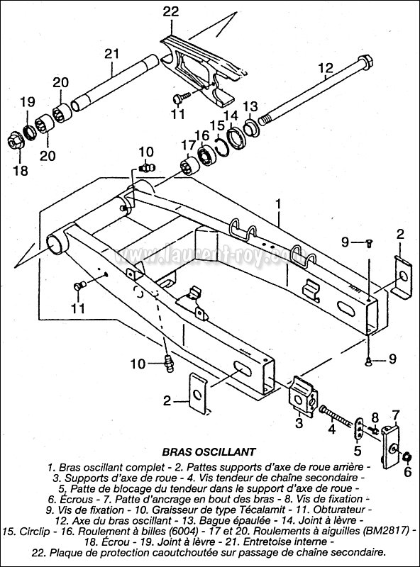 | On peut voir ici le système d'amortissement arrière de type "Uni-Track", ainsi que l'implantation des deux béquilles. Les deux pattes soudées au cadre à l'arrière de l'axe de bras oscillant sont censées accueillir le pare chaîne. |