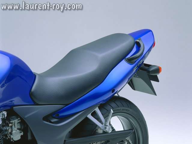 | L'arrière est relativement esthétique, et en accord avec la ligne de la moto. Les poignées de maintien sont confortables, et restent accessible après le montage d'un top-case. Des crochets de fixation permettent de faciliter l'arrimage de bagages. |
